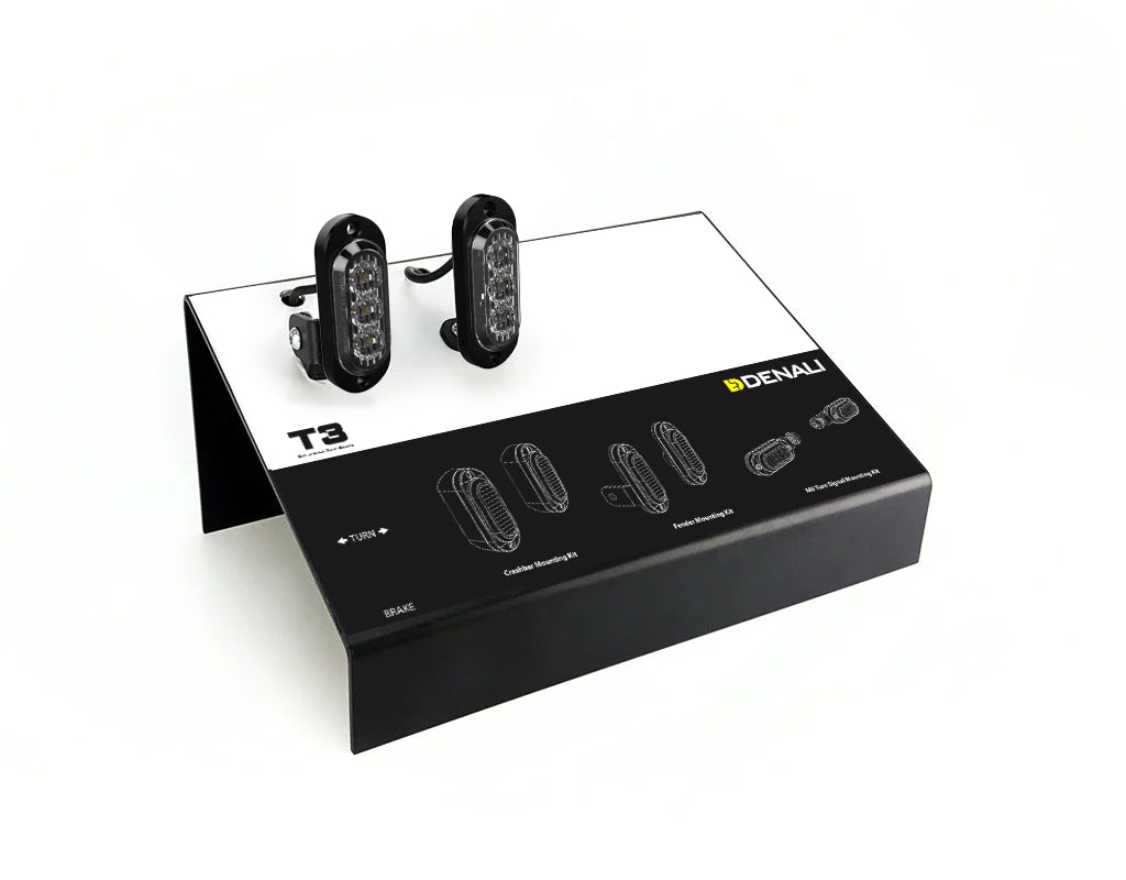 Seeing is believing! Once your customers see the power of the DENALI T3 Rear Modular Switchback Signal Pods they’ll be sold. The interactive dealer display can be plugged directly into an 100v-240v outlet, or by using the included battery power wiring adapter, the display can be powered from a standard motorcycle battery, perfect for those remote events where power isn’t available. Sturdy metal construction allows mounting the unit on a shelf, counter or slat-wall (brackets not included).